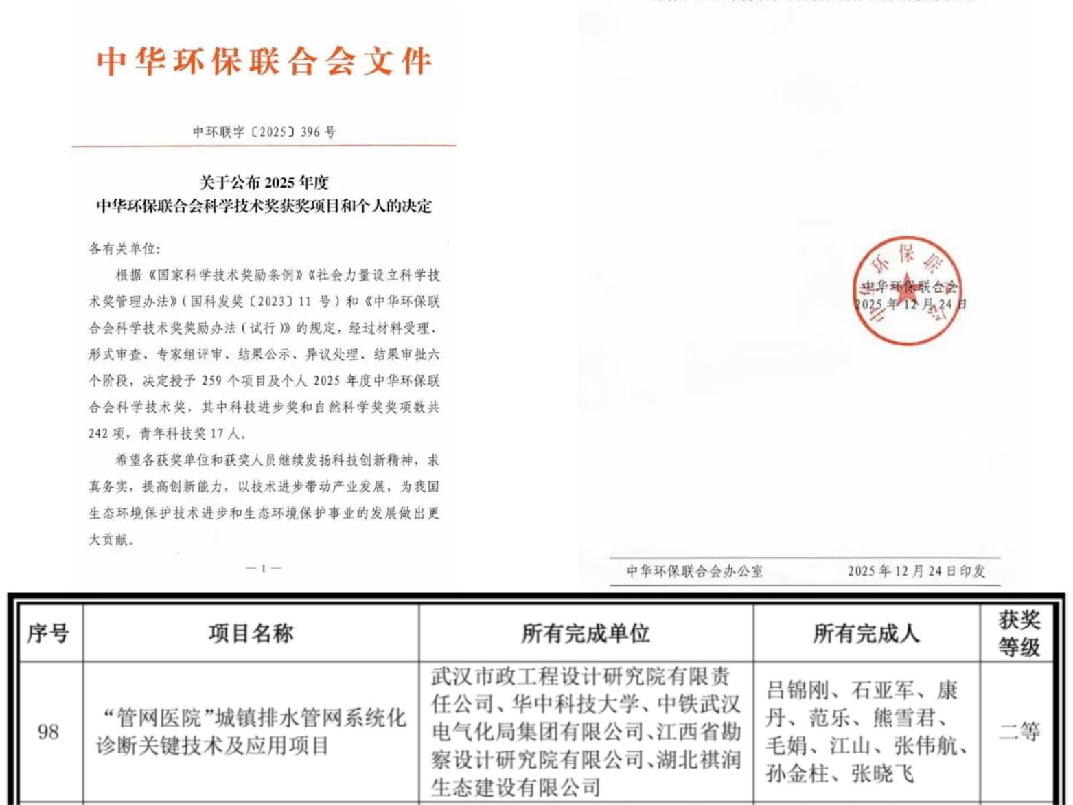 ? ? 近日,武漢市政院自主研發(fā)的“‘管網(wǎng)醫(yī)院’城鎮(zhèn)排水管網(wǎng)系統(tǒng)化診斷關(guān)鍵技術(shù)及應(yīng)用研究”,經(jīng)中華環(huán)保聯(lián)合會(huì)在北京組織技術(shù)成果評(píng)價(jià)會(huì)議評(píng)審,順利通過科技成果評(píng)價(jià),被認(rèn)定為達(dá)到“國(guó)際先進(jìn)水平”,并榮獲“2025年中華環(huán)保聯(lián)合會(huì)科技進(jìn)步獎(jiǎng)二等獎(jiǎng)”。