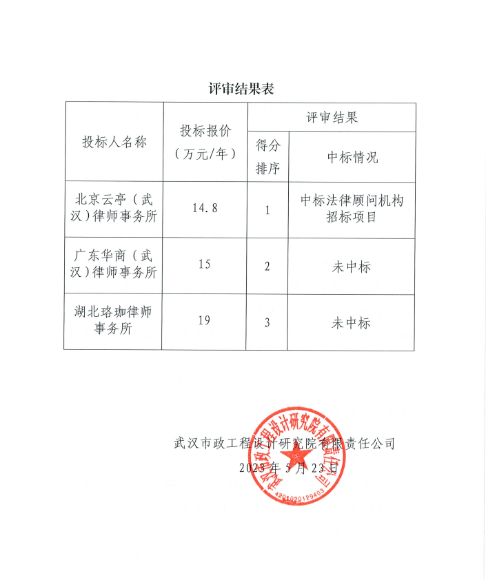 武漢市政工程設(shè)計(jì)研究院有限責(zé)任公司關(guān)于法律顧問(wèn)機(jī)構(gòu)招標(biāo)結(jié)果的公示